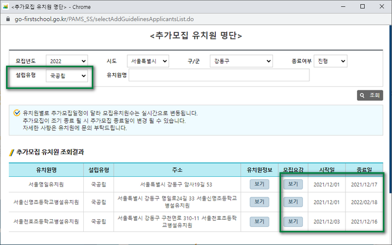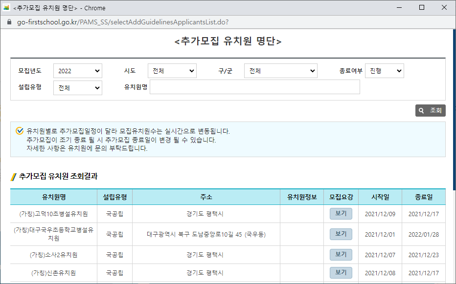 현재는 추가모집을 진행하고 있는 기간인데요. 사용하는건 어렵지않아요. 모집년도는 당연히 2022년으로 고정되어 있구요. 원하는 시도, 구군, 종료여부정도를 골라요. 사립이냐 공립이냐는 설립유형으로 필터할수 있습니다.
