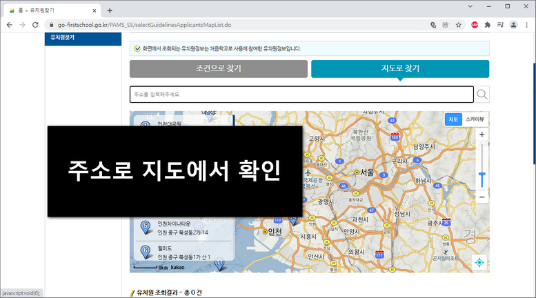 웹페이지에서 위쪽을 보시면 유치원찾기 메뉴가 따로 있는데요. 조건을 사용해서 검색할수도 있지만 지도에서 확인도 가능합니다.