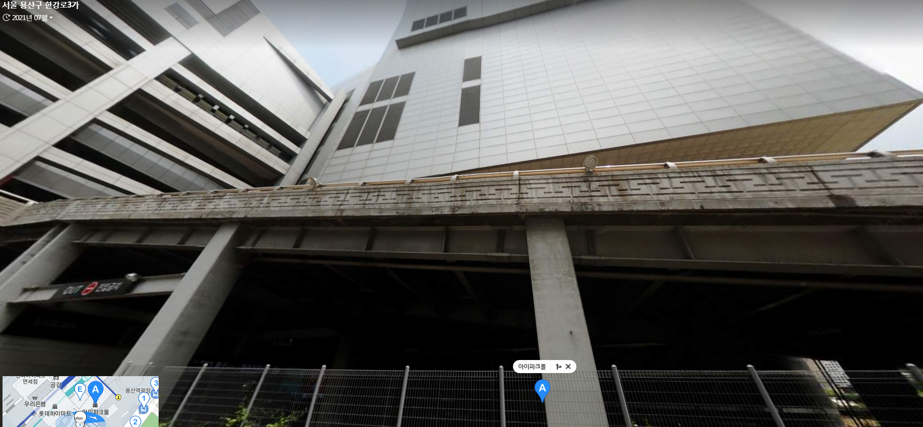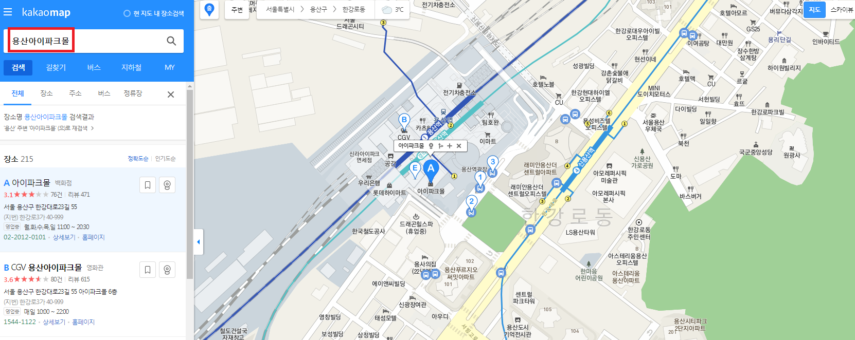 예를 들어 '용산아이파크몰'을 찾았더니 지도에 마커로 해당 위치가 표시가 되었습니다. 지도는 확대와 축소로 상세히 보실 수 있으며, 스카이뷰나 로드뷰를 적용하실 수도 있습니다.