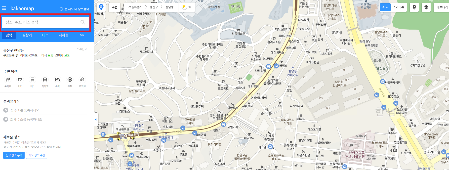 이렇게 들어가신 후에 지도와 별개로 검색창을 이용하여 장소, 주소, 버스 등의 내용을 채워서 원하는 곳을 찾을 수 있습니다. 결과는 카카오 지도에 등록된 곳은 즉시 나오게 되어지기 때문에 확인하시기 간편합니다.