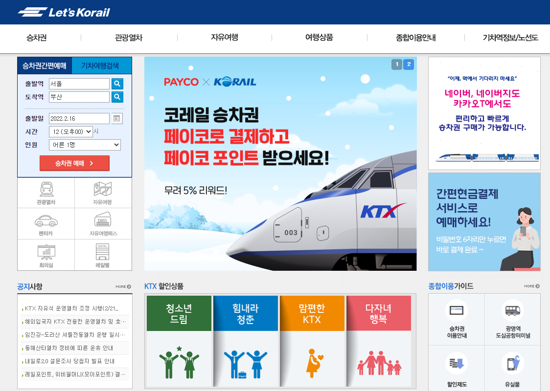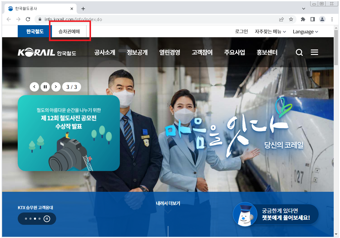 그전에 미리 알아두셔야할점은 한국철도공사에서 운영을 하고 있는 코레일 홈페이지와 승차권예매를 담당하고 있는 레츠코레일은 따로 운영이 되어지고 있습니다. 때문에 한국철도공사 페이지에서는 예매를 지원하지 않고 공사소개나 사업 등만 지원되어집니다.