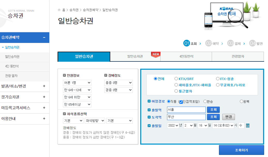 뿐 아니라 여행관련된 상품도 확인할 수 있도록 제공되어집니다. 다만 많은 분들은 승차권을 예매하는 용도로 활용을 할 것 같네요. 조회를 인권, 좌석, 출발역, 도착역, 출발일을 통하여 지정을 해주시면 검색이 되어집니다.